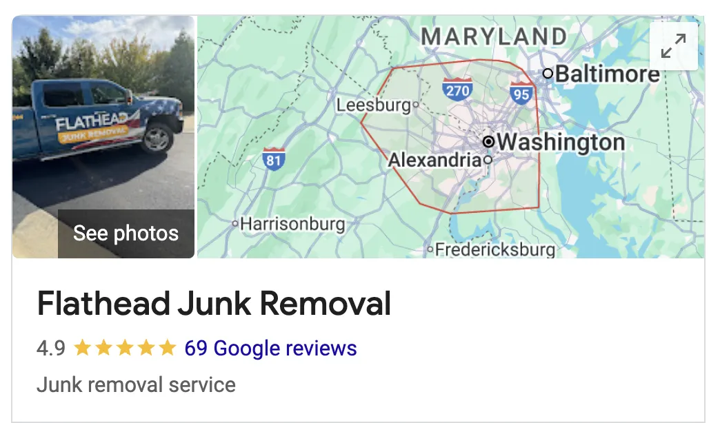 We proudly serve Northern Virginia and ALL surrounding areas. Call us today to get your fast and free quote for your junk pickup.